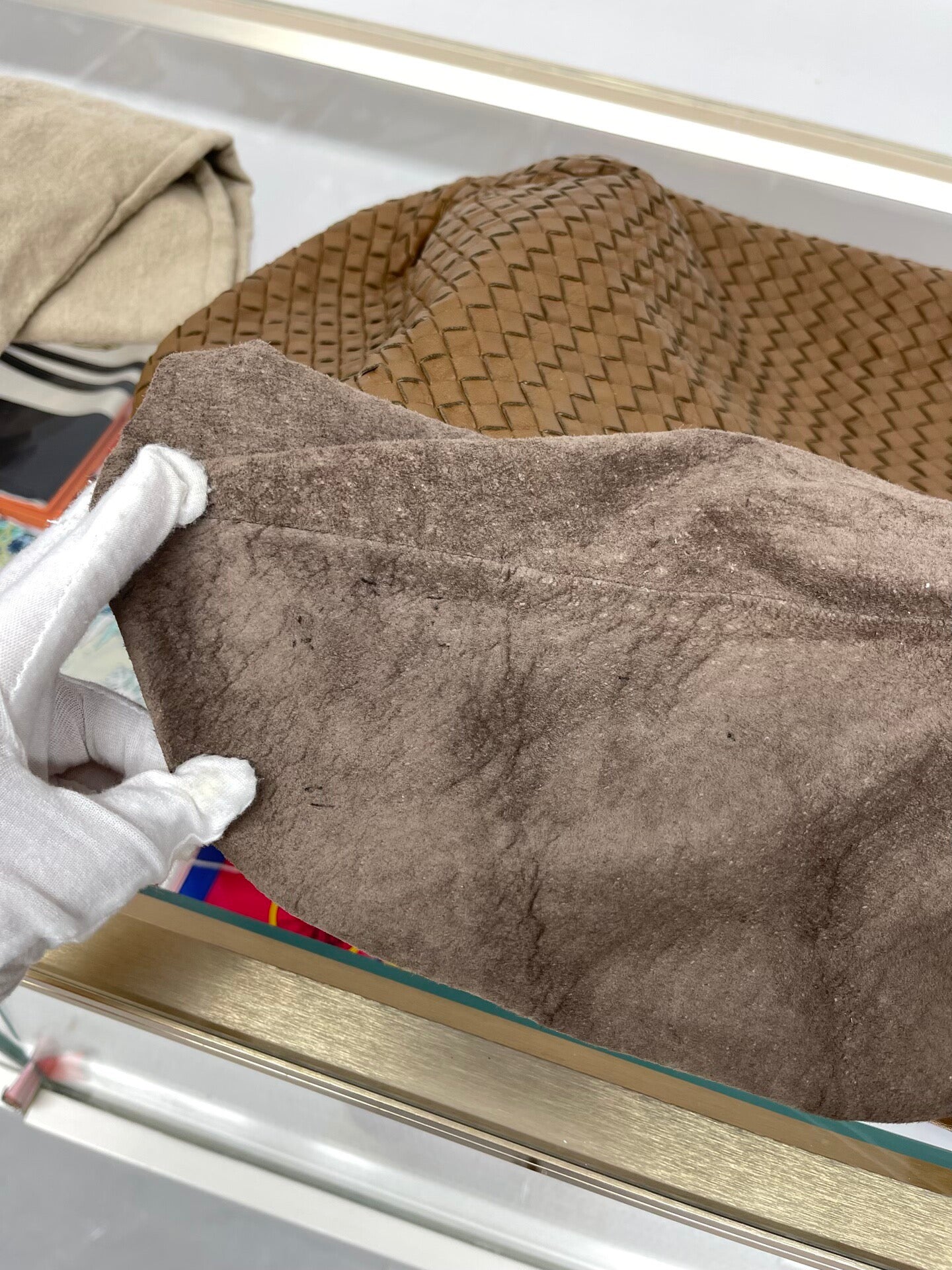Leather creases. Rubbing around the corners, handle, and along the zipper. Light stains on the inside.