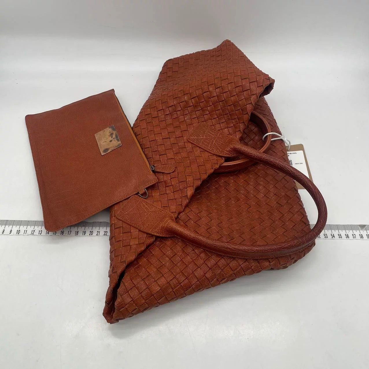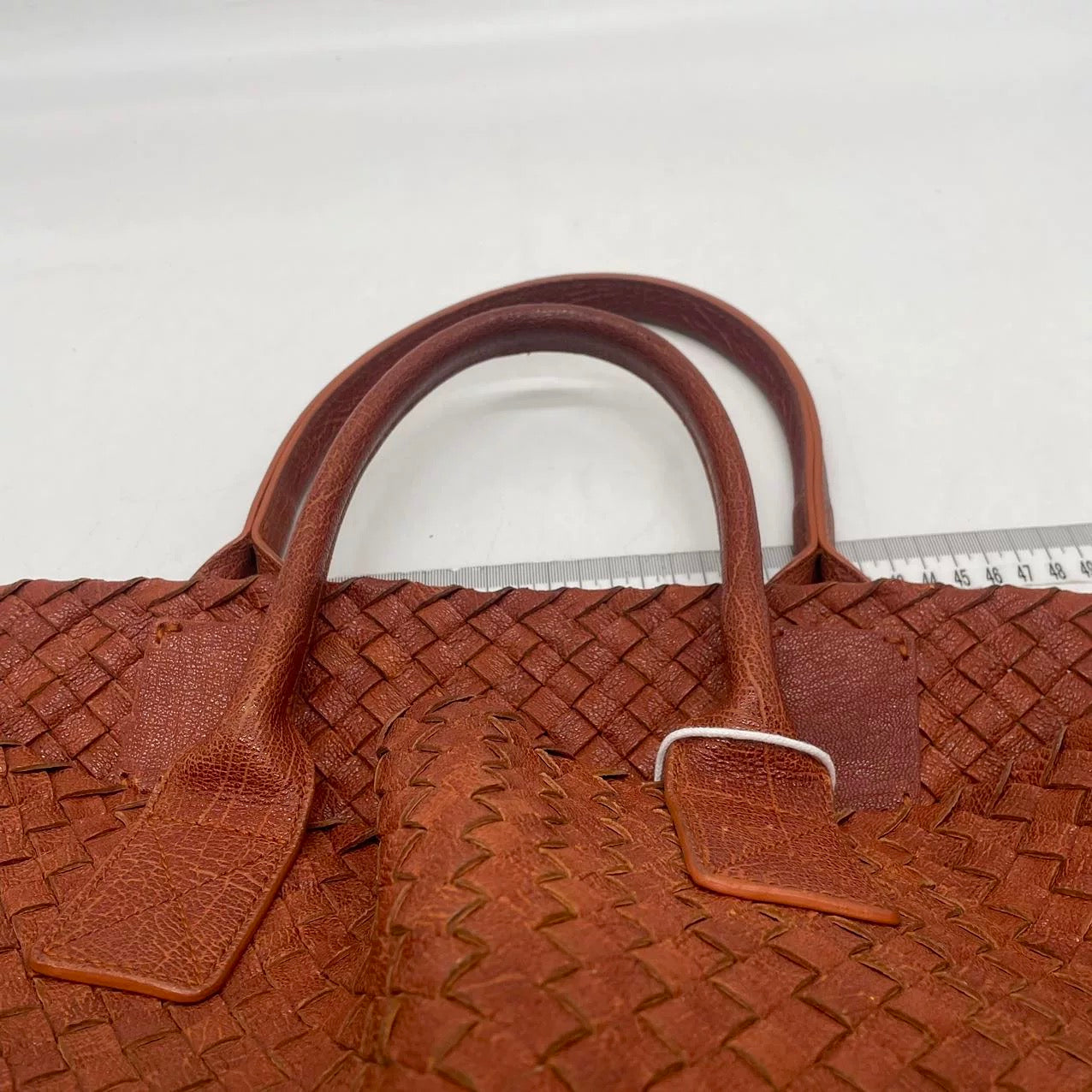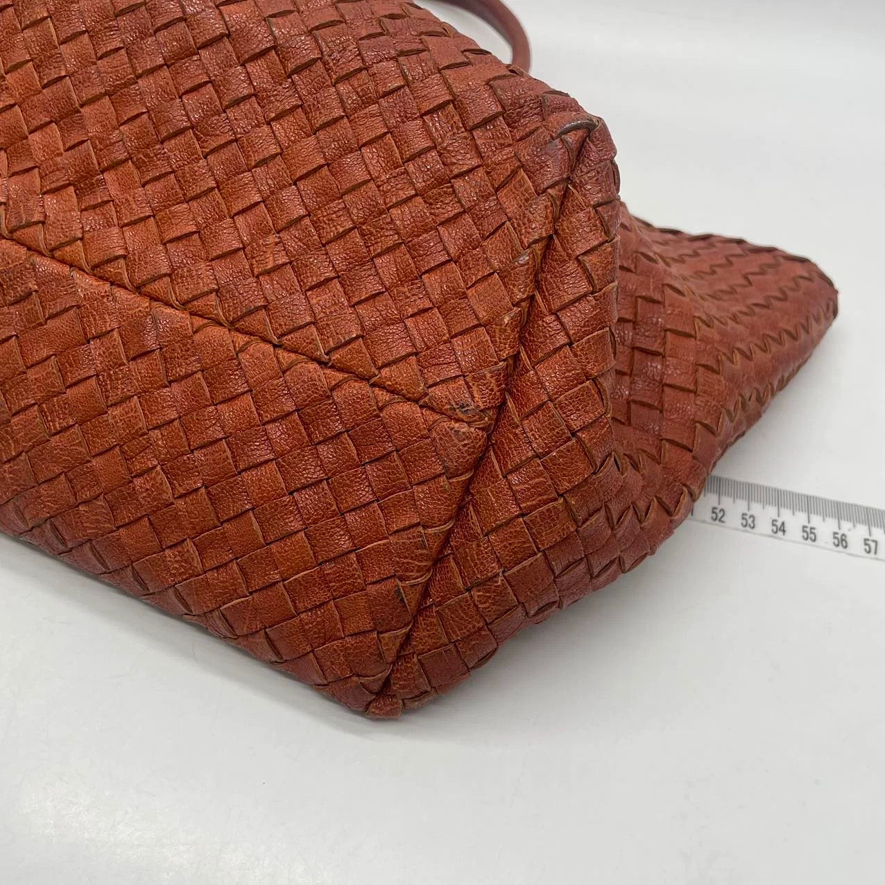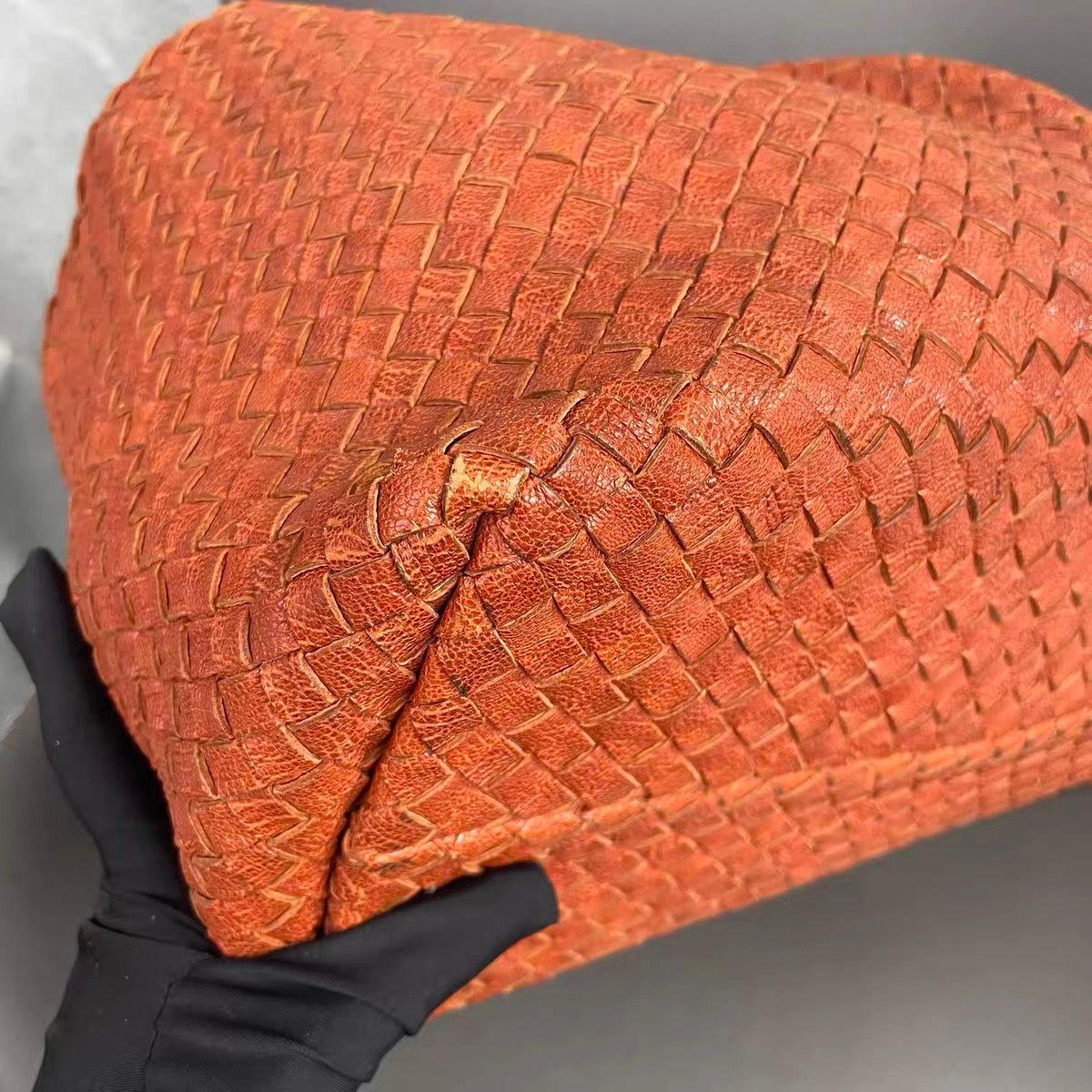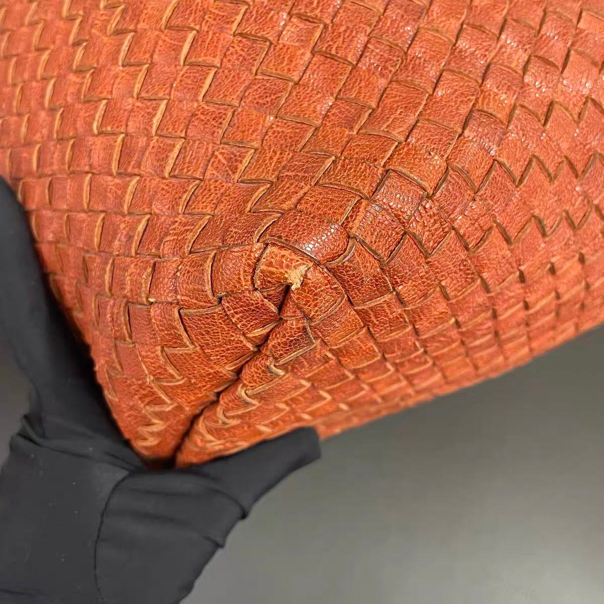 This preowned BV cabat tote bag is in very good condition with some signs of wear. Light creases, stains and scratches on the leather, and handles. Cracks to the wax along the edges. Scratches to hardware. Scuffs around the corners.