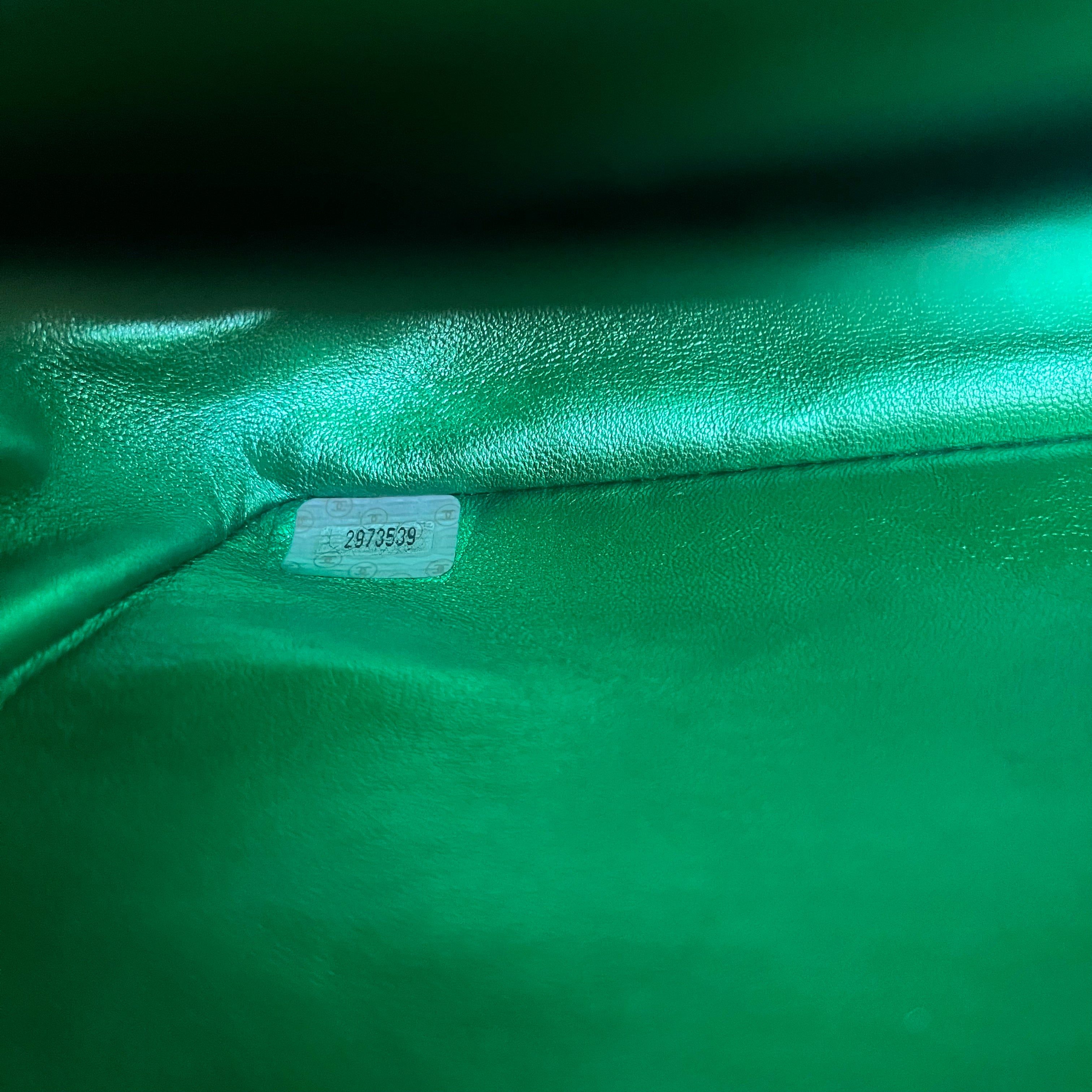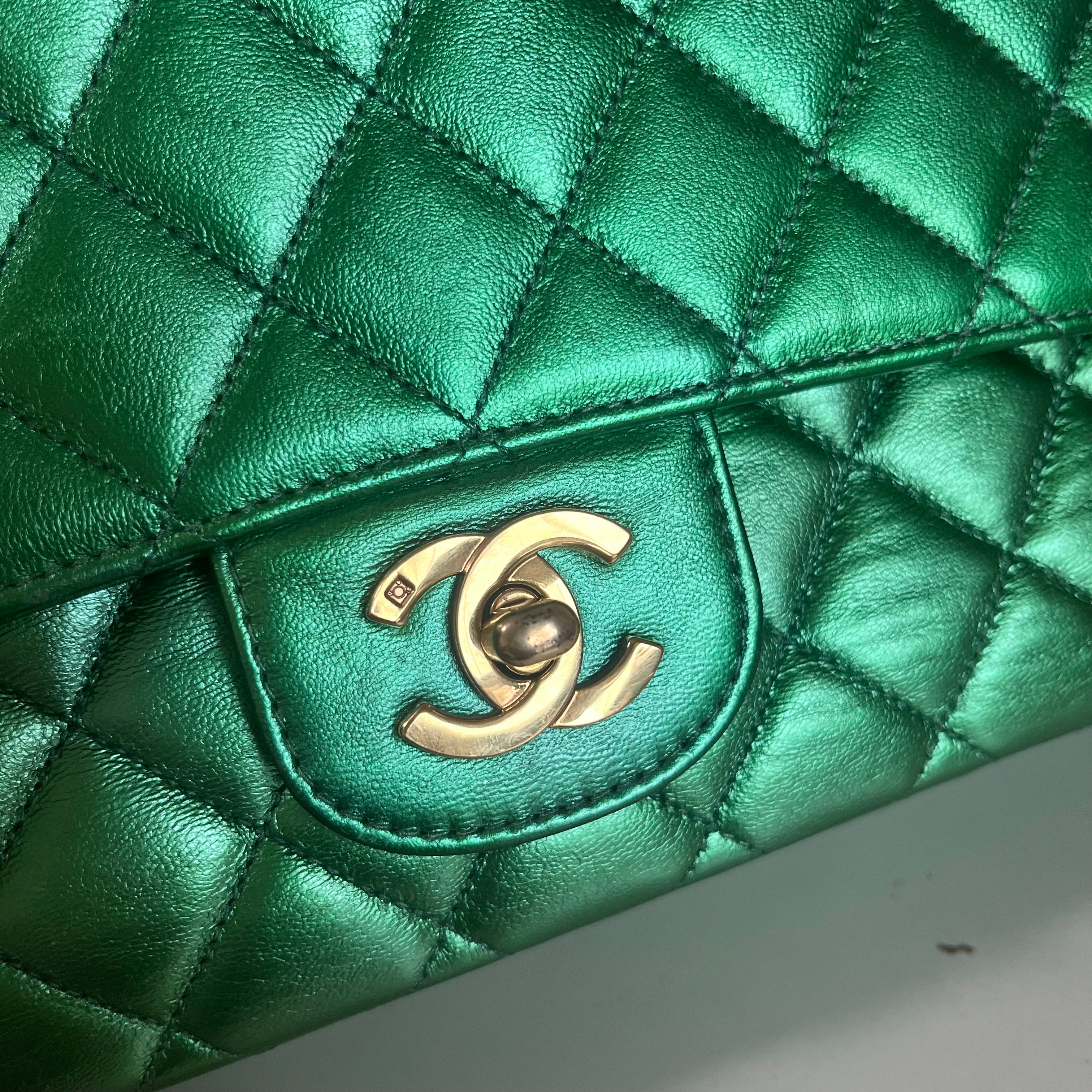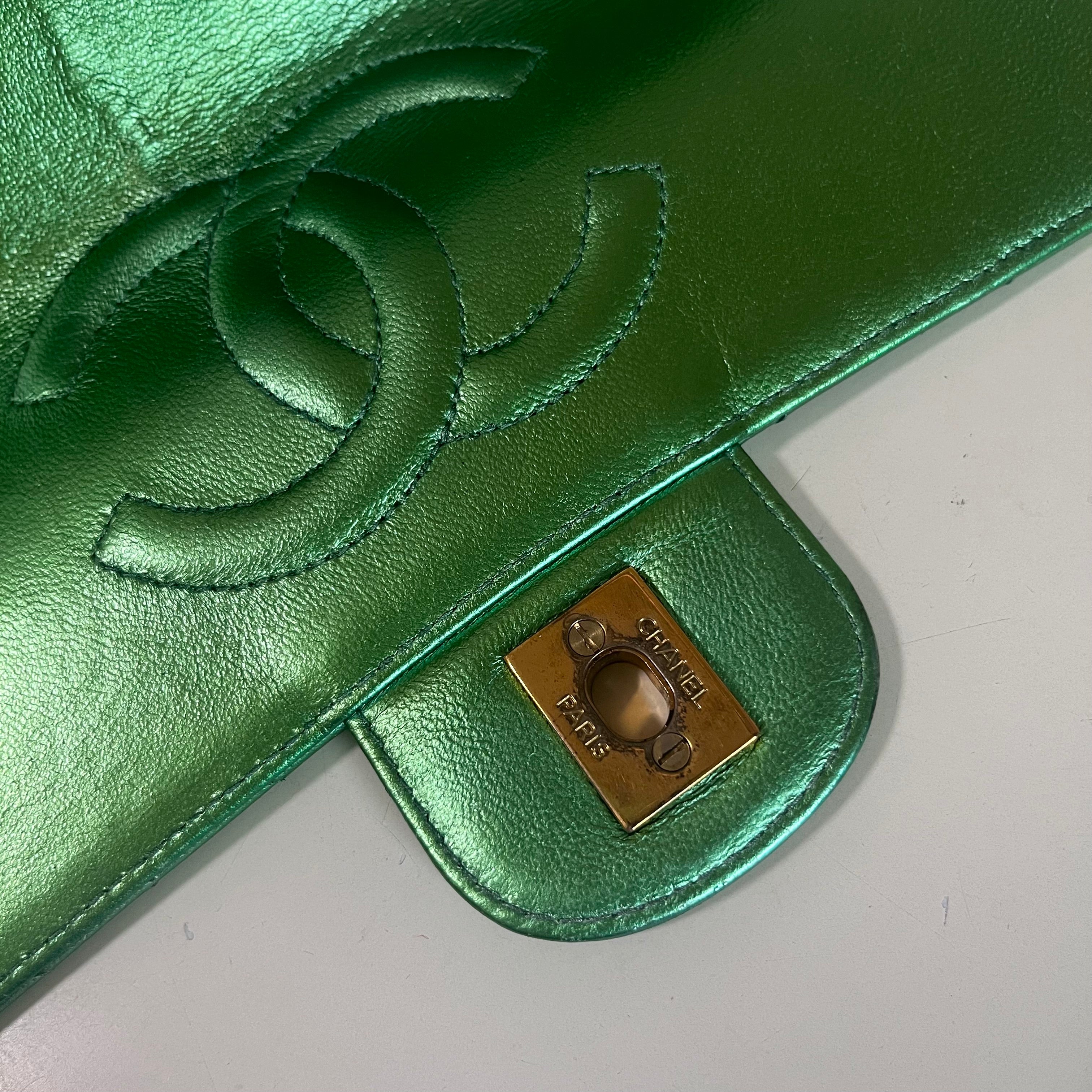 Sold Chanel 1994 Classic Flap Kelly Top Handle Bag Medium Metallic Green Lambskin Leather