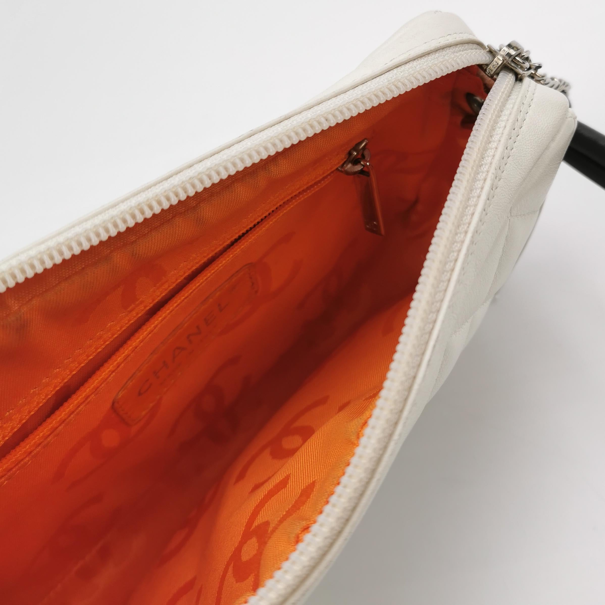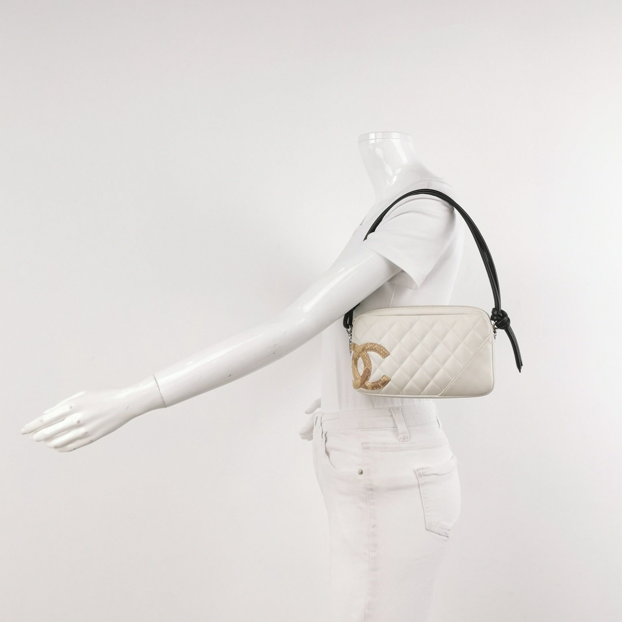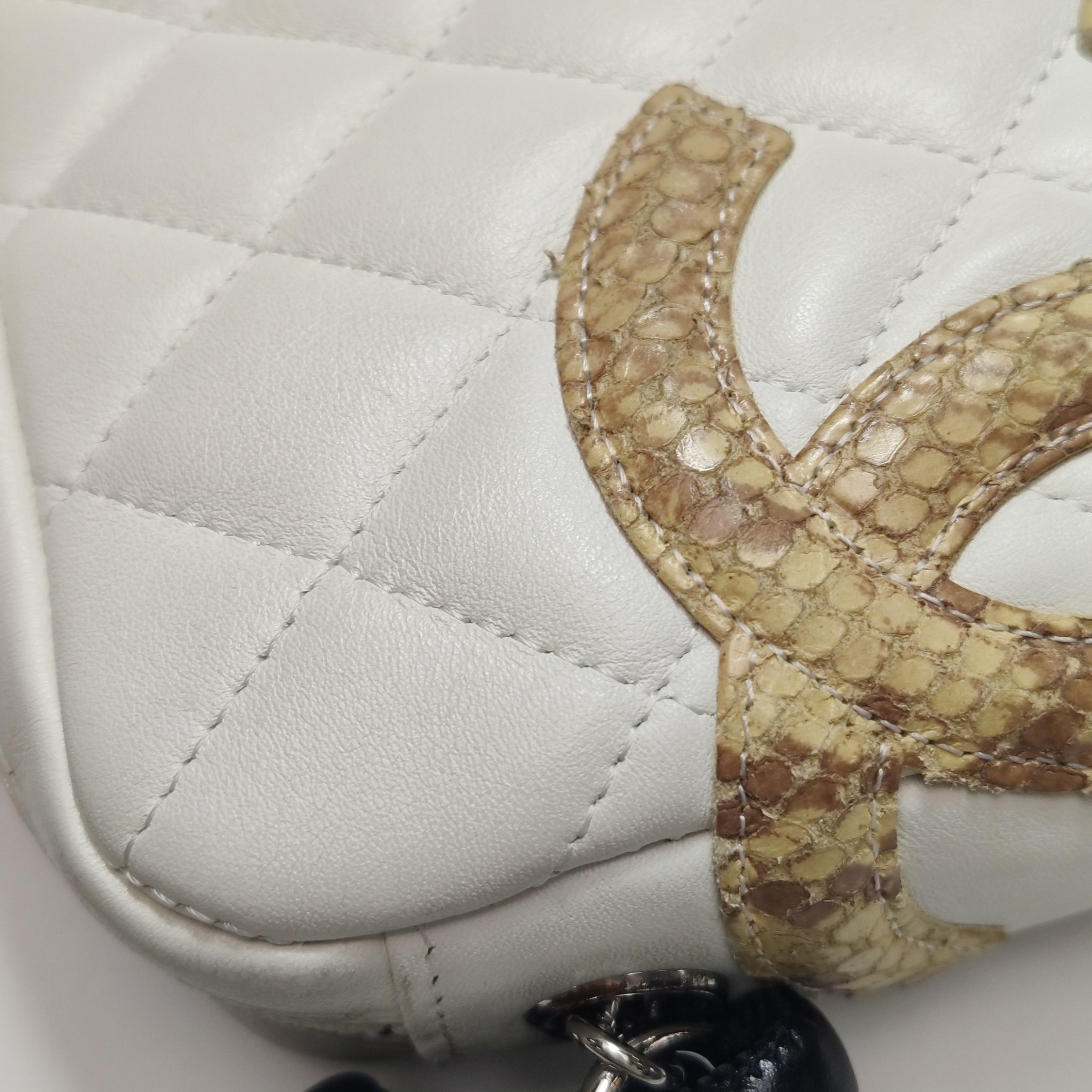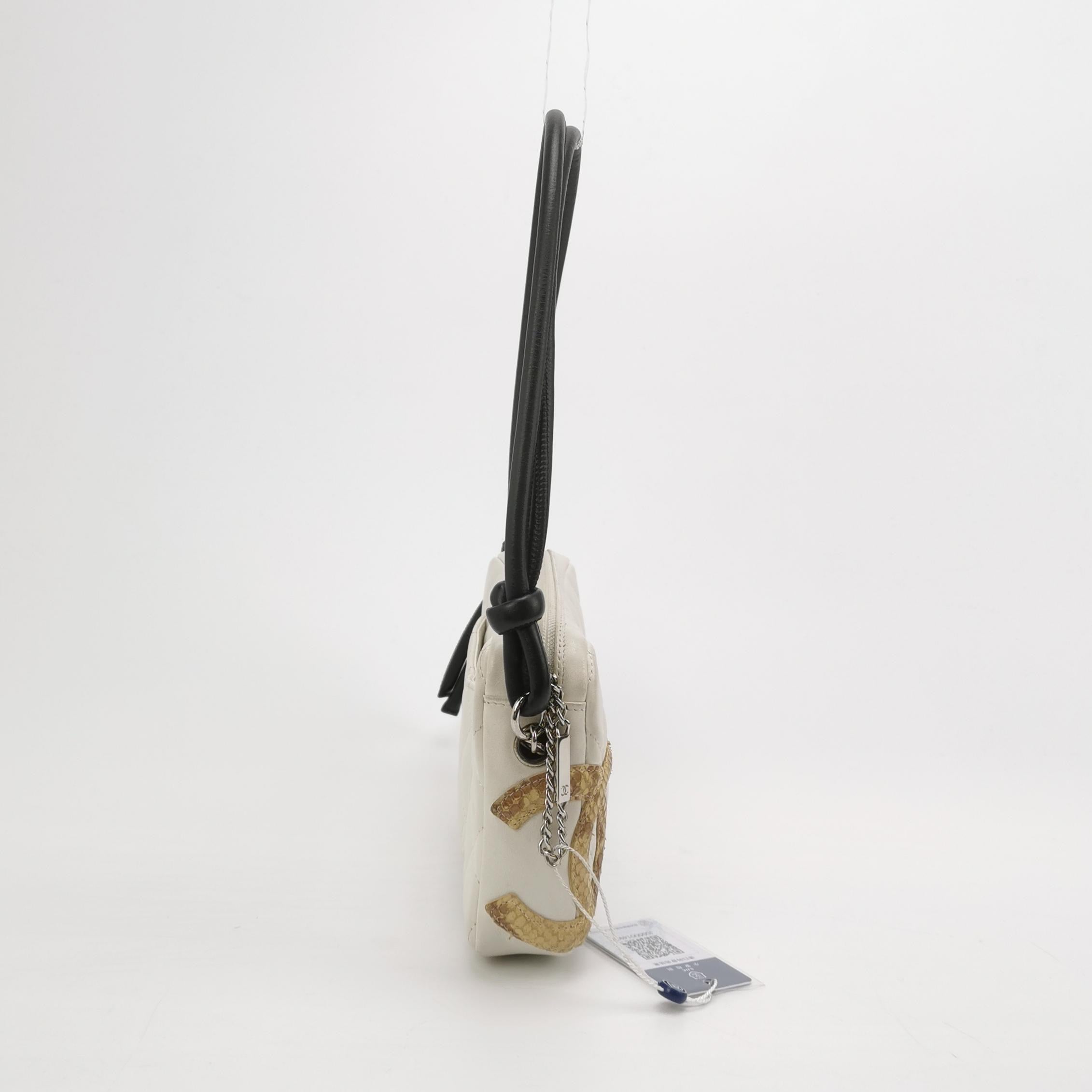 Chanel Cambon Clutch White Leather Snake Skin CC Logo Black Strap