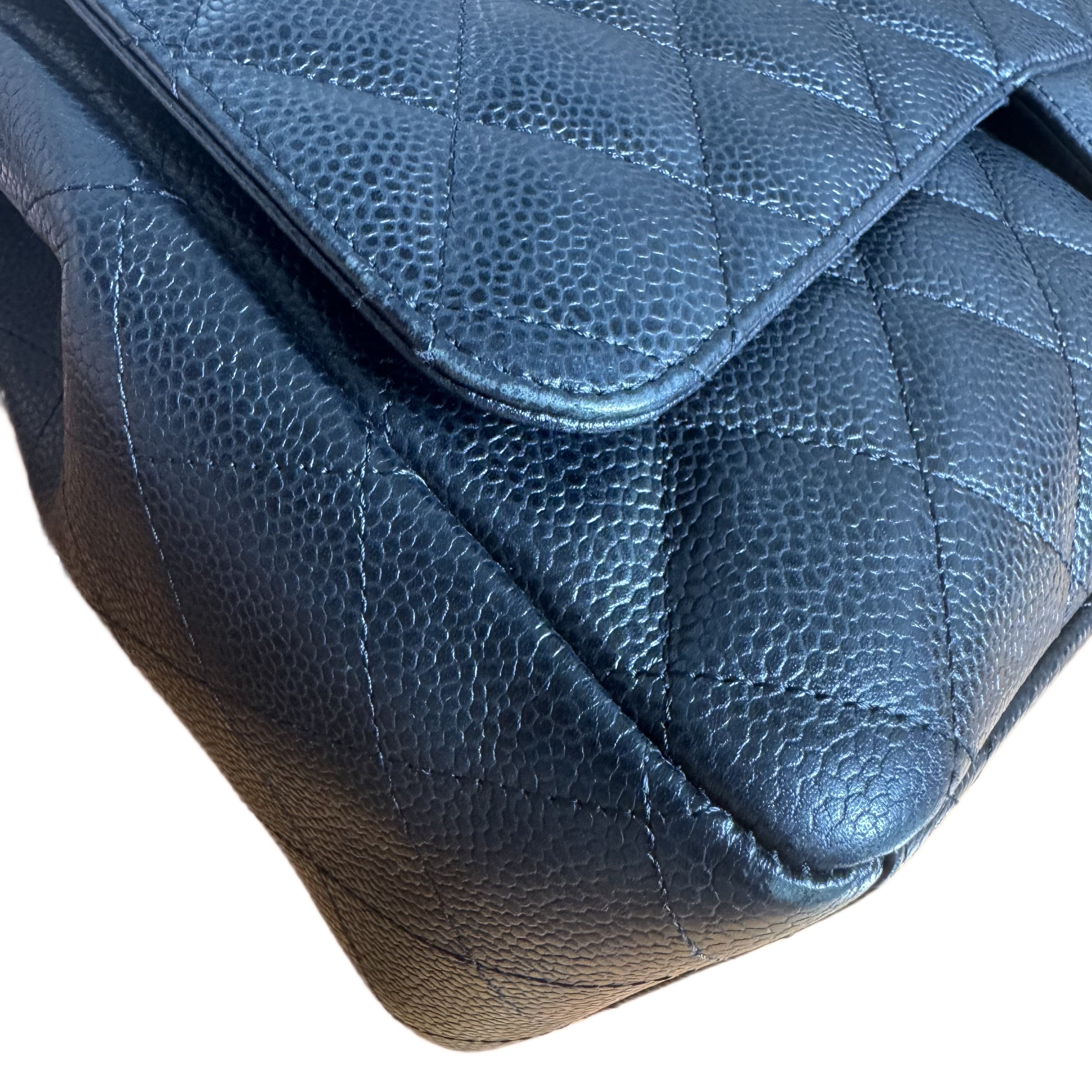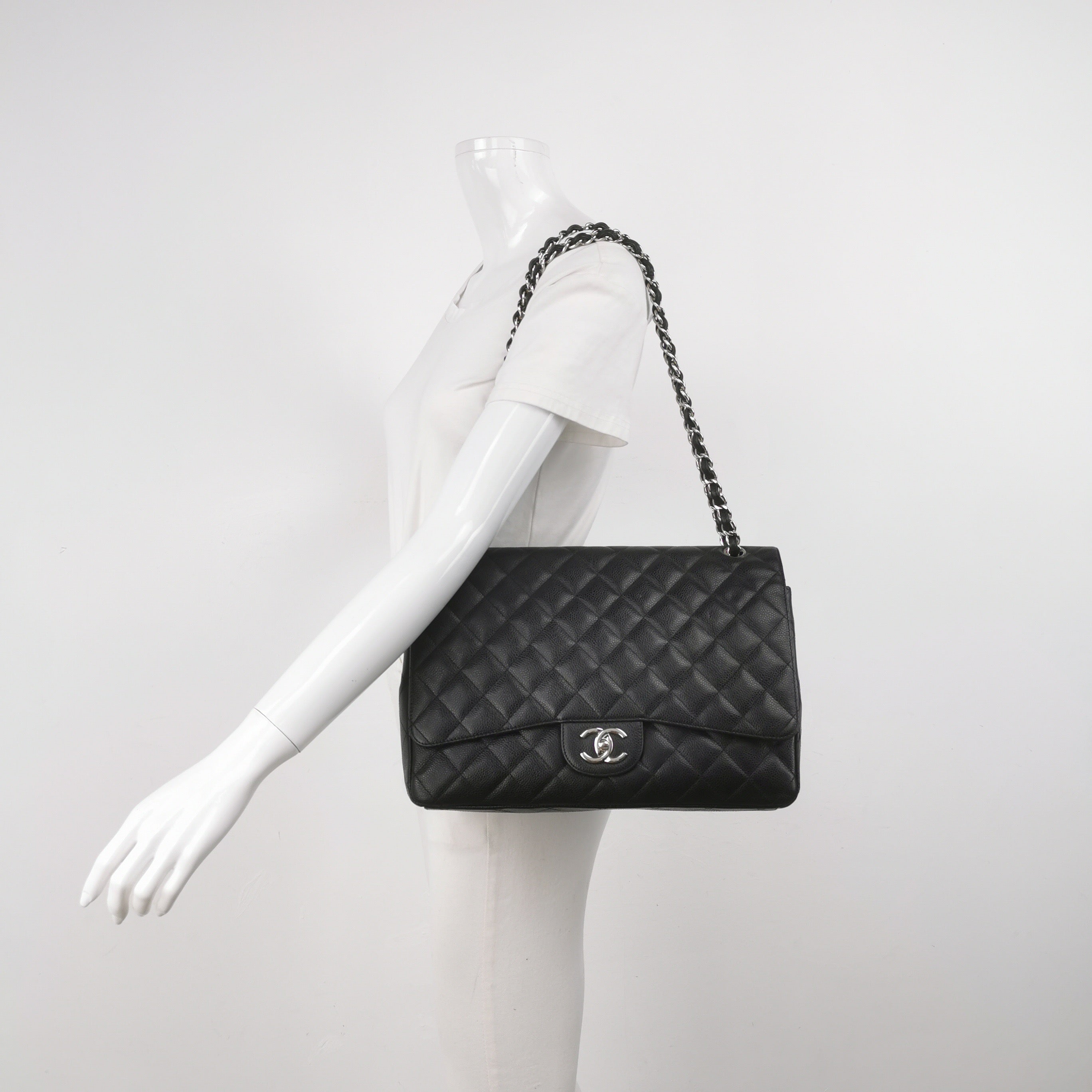 Chanel Classic Flap Maxi Black Caviar Leather Double Flap Sliver Hardware