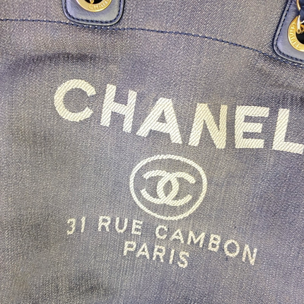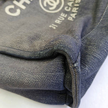 Chanel Deauville Tote Medium Navy Denim Top Handle Leather Chain Straps