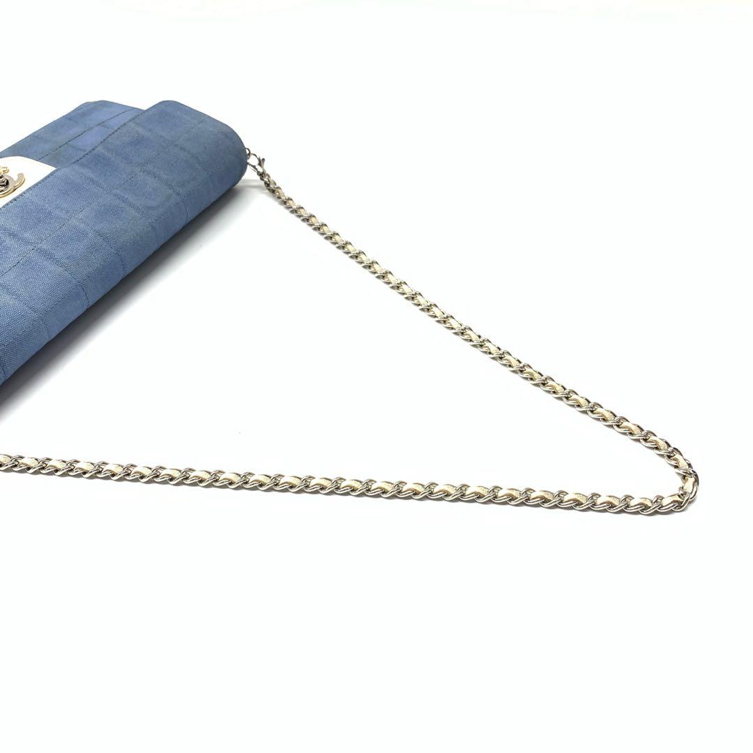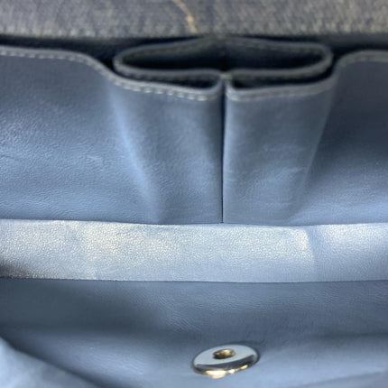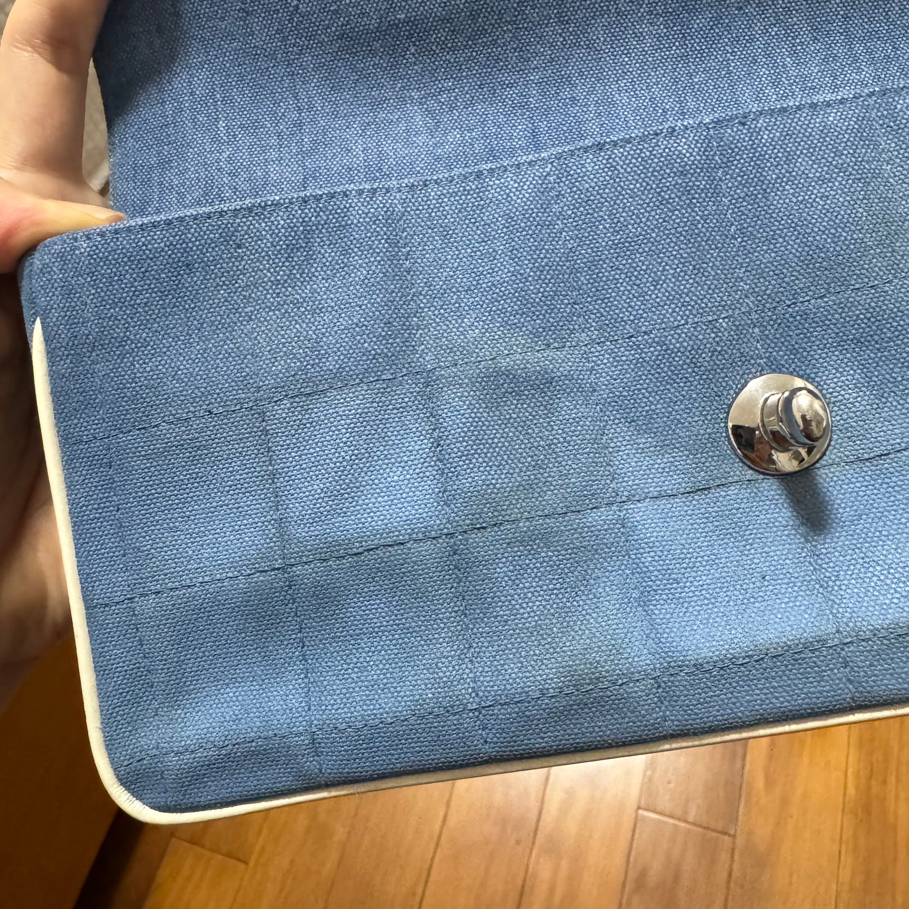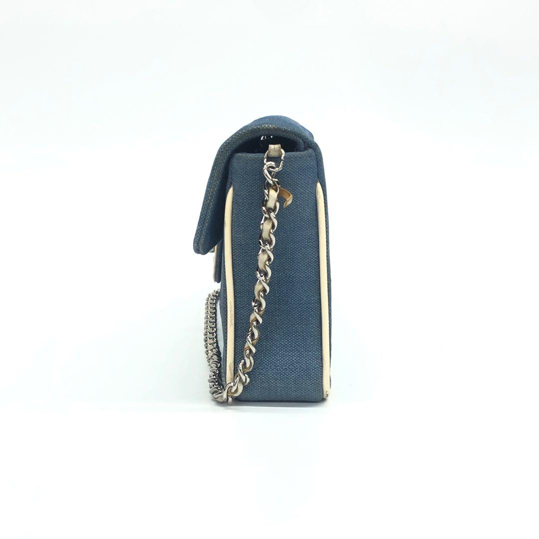 Chanel East West Chocolate Bar Blue Denim Beige Leather Piping Silver Hardware