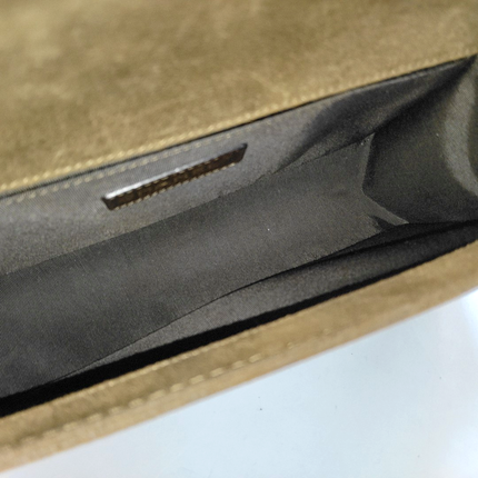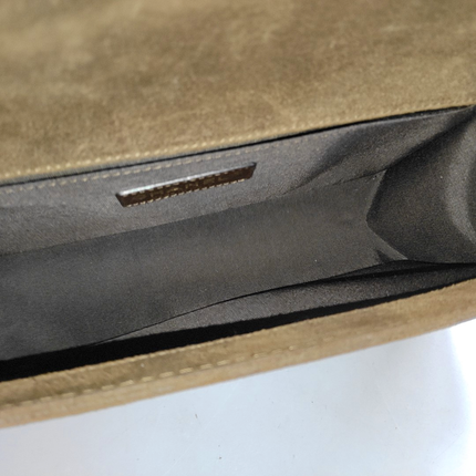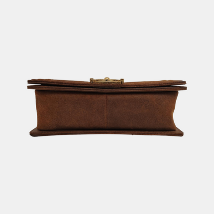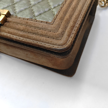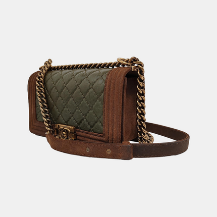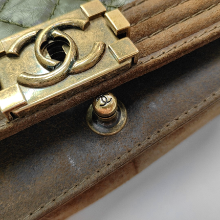 Chanel Le Boy Medium Dark Green Calfskin Brown Suede Leather Bag Gold Hardware