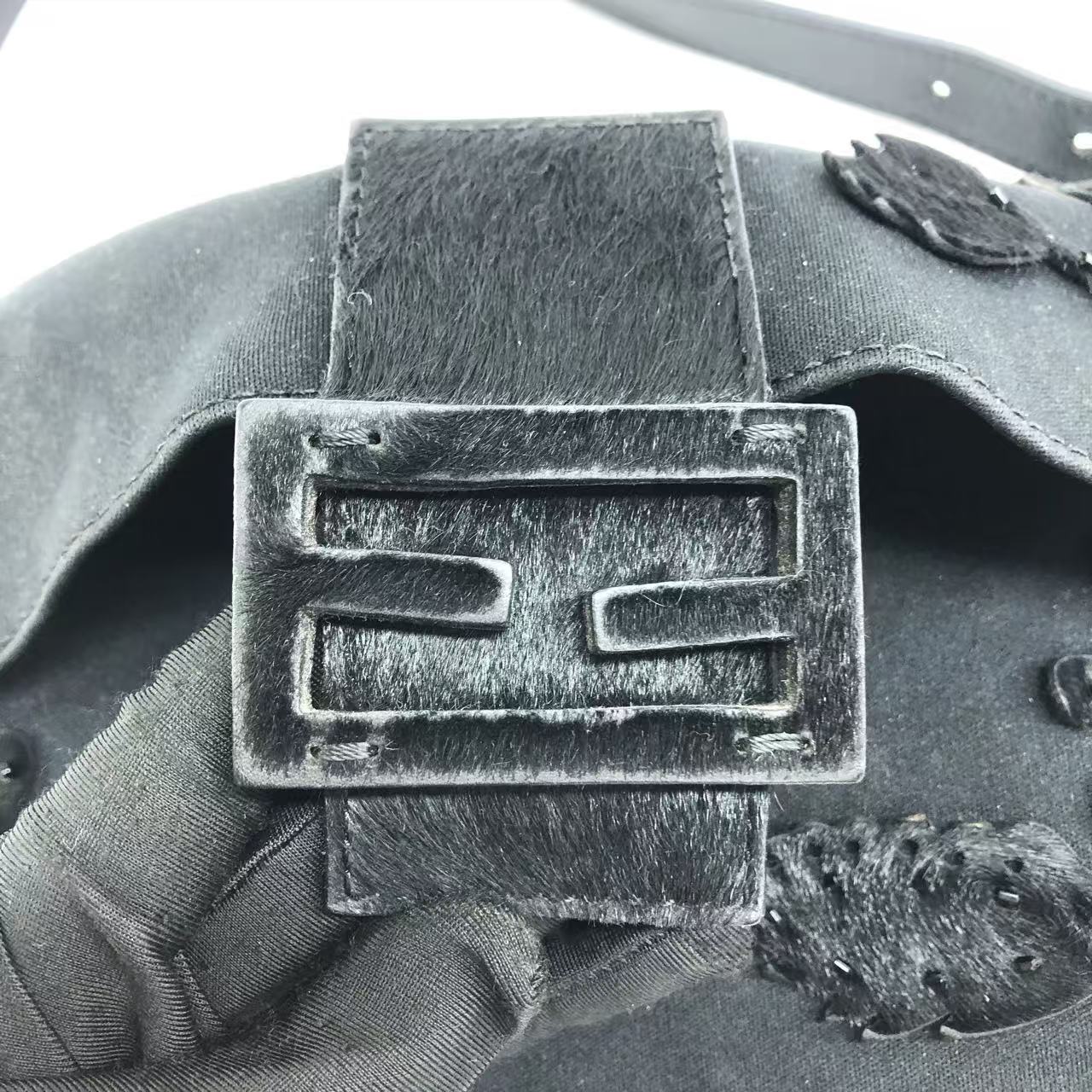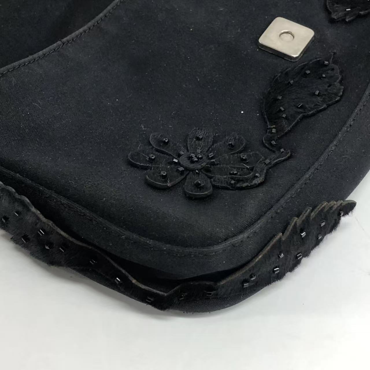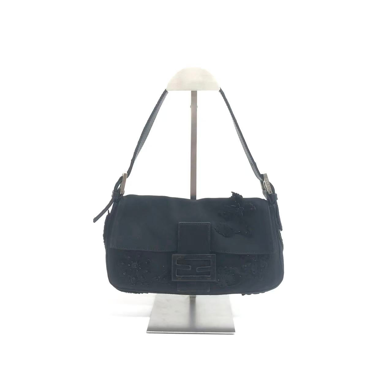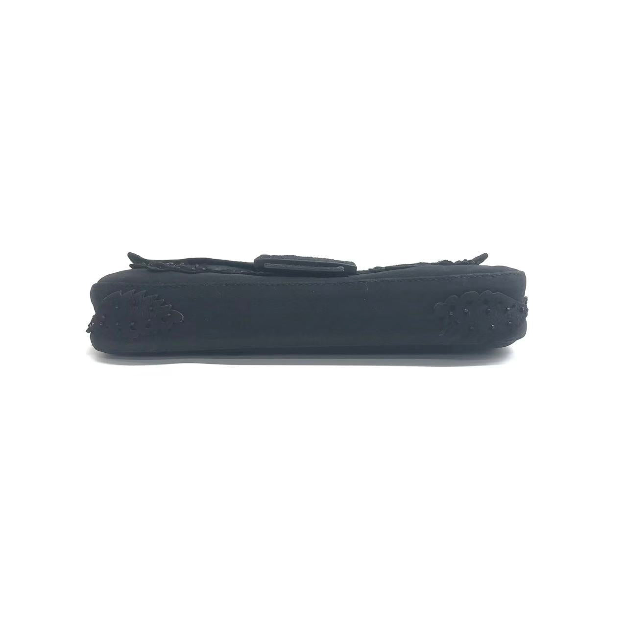 FENDI Baguette Vintage Black Cloth With Flower Embroidery Silver Hardware