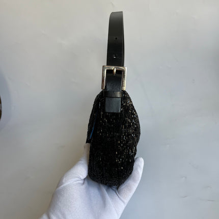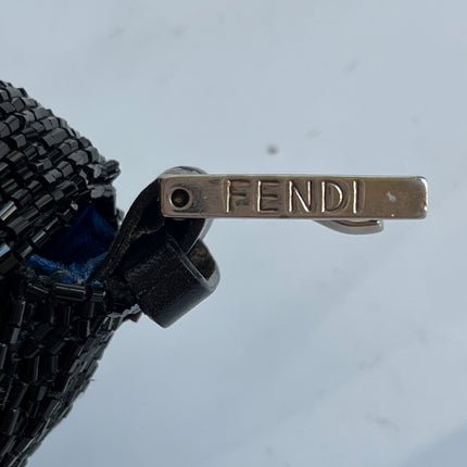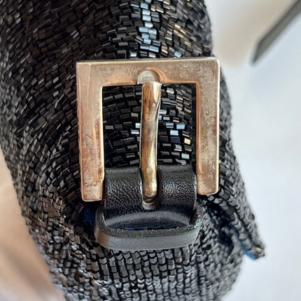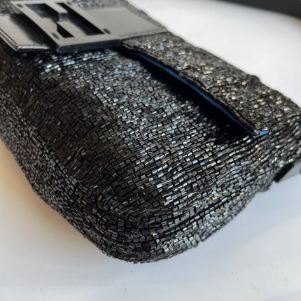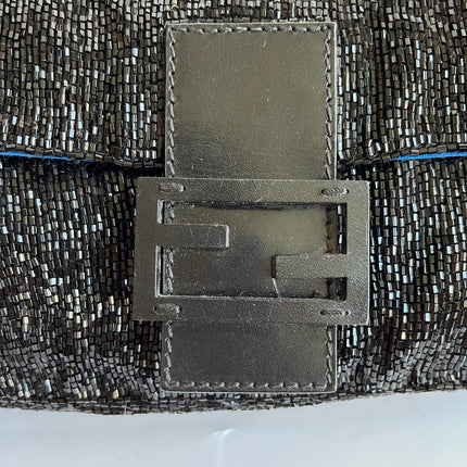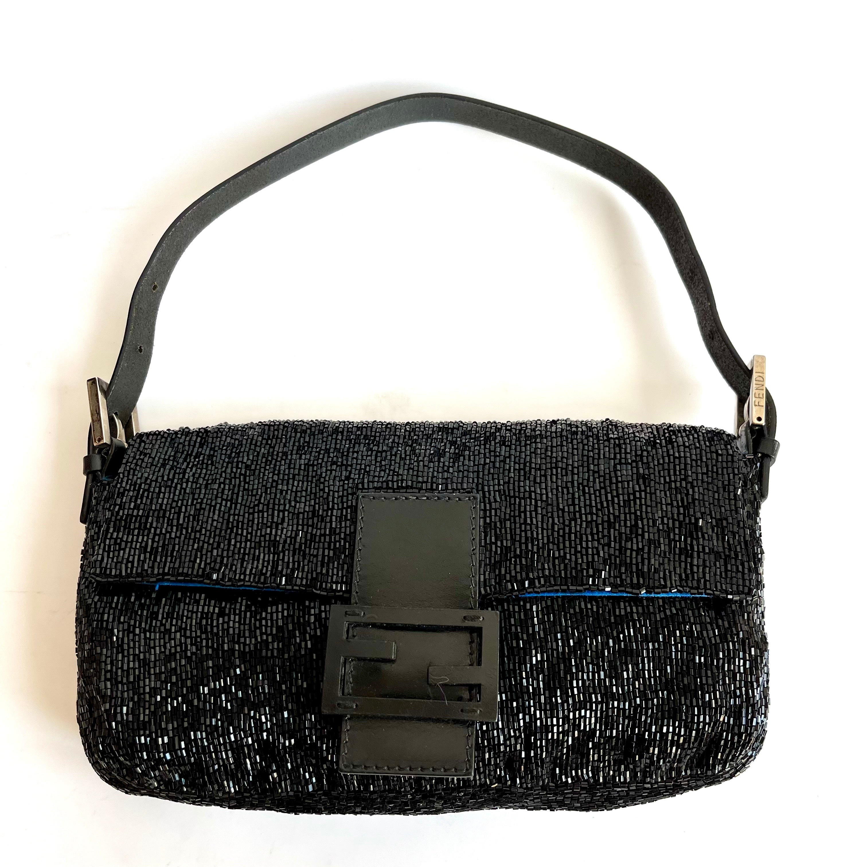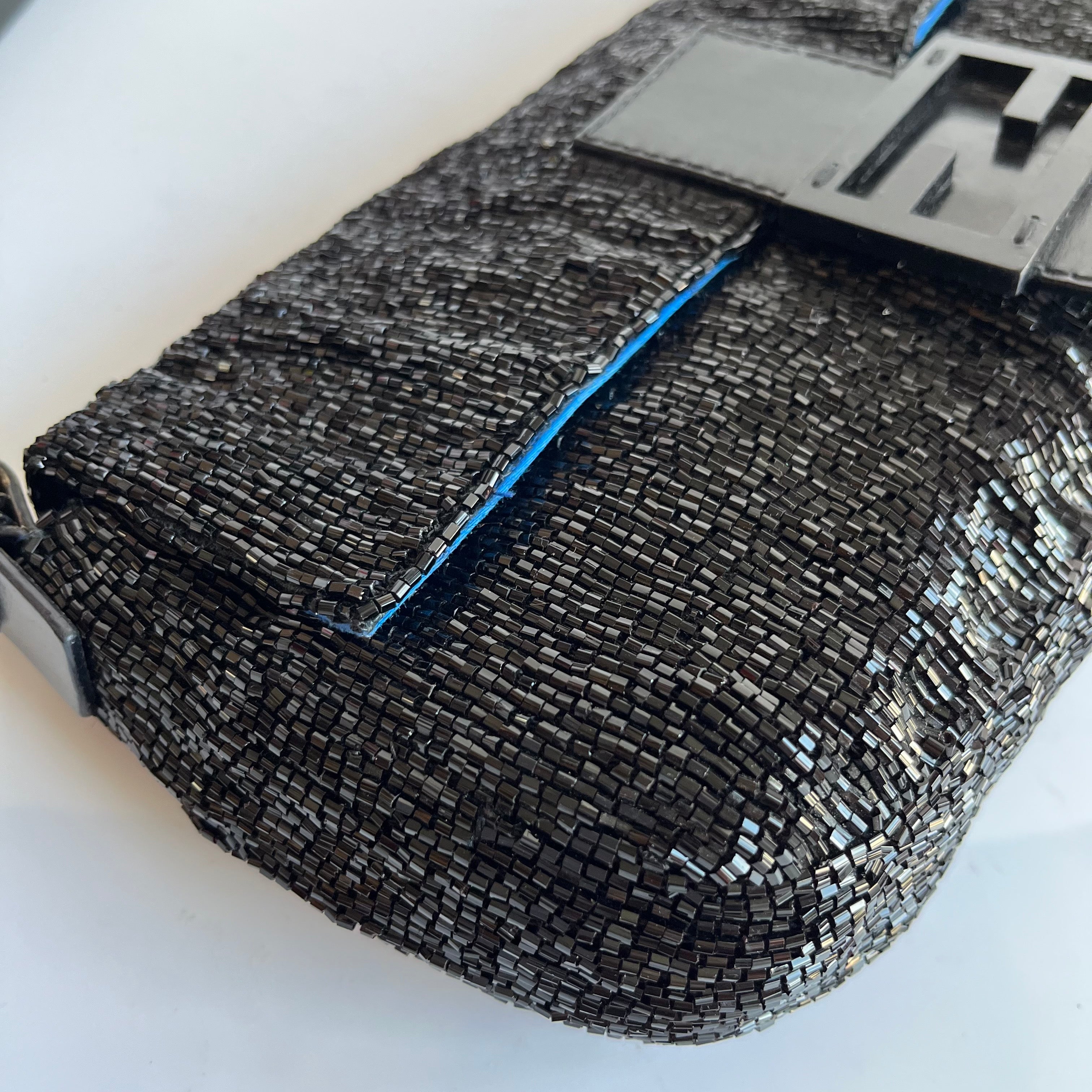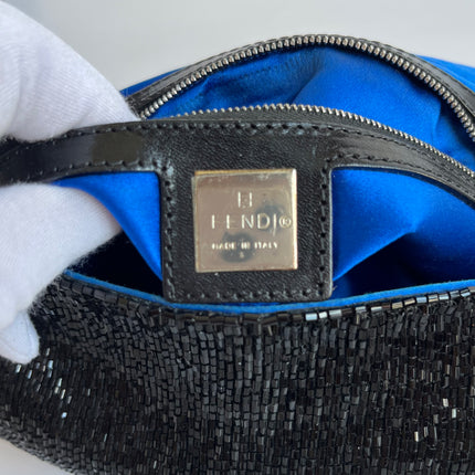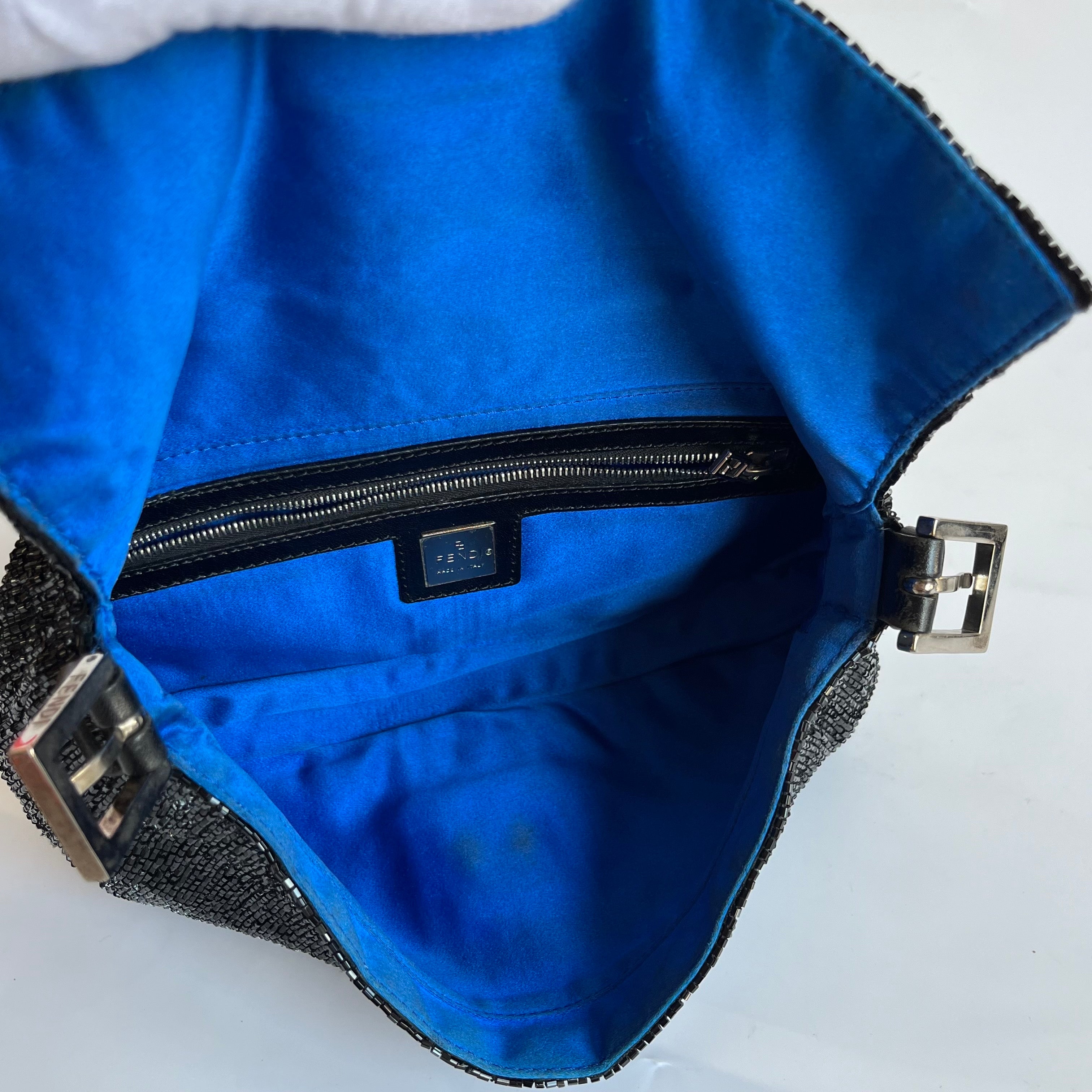 Fendi Baguette Vintage Black Glitter Beads Shoulder Bag Blue Silk Interior