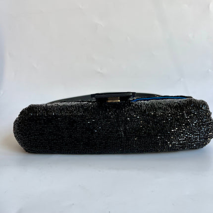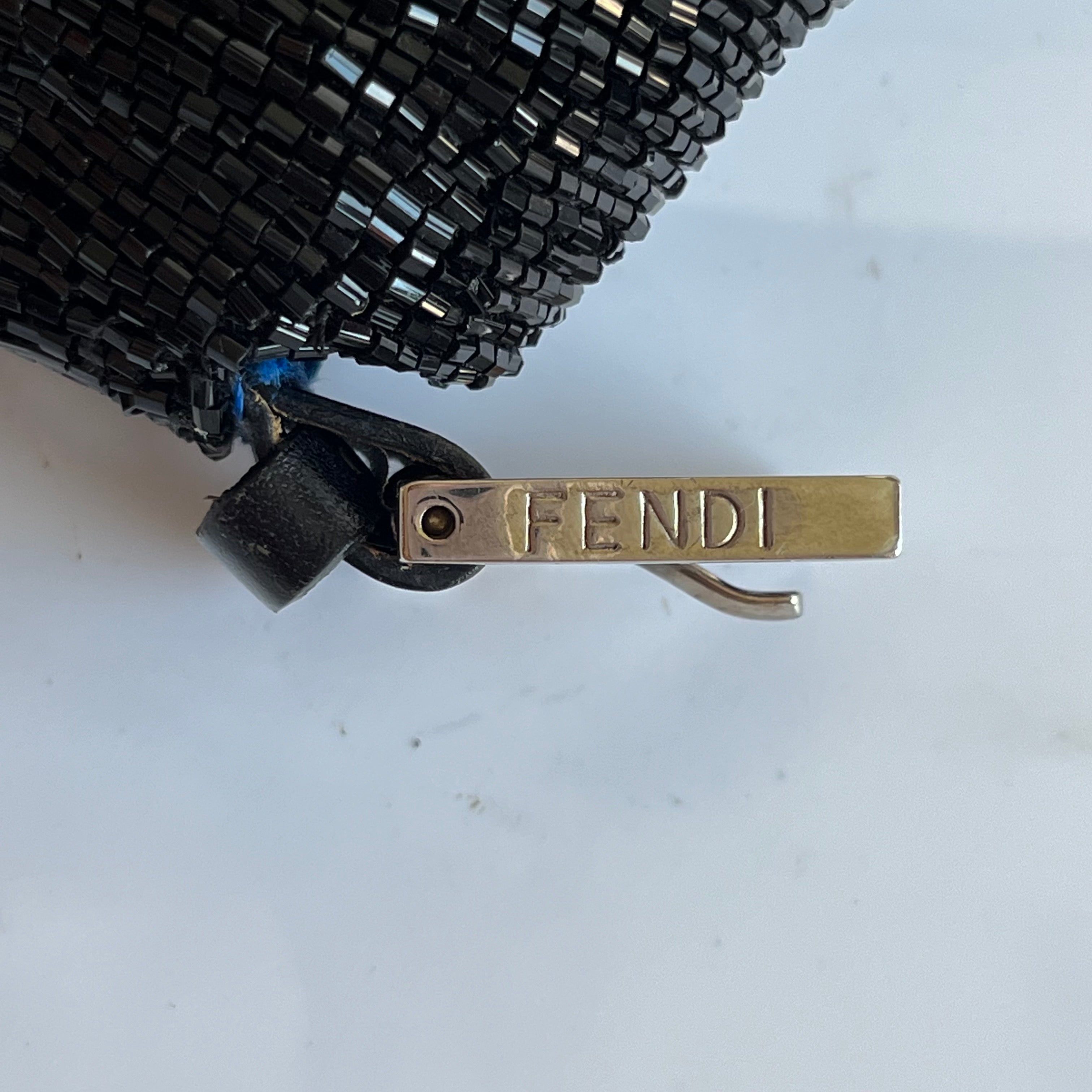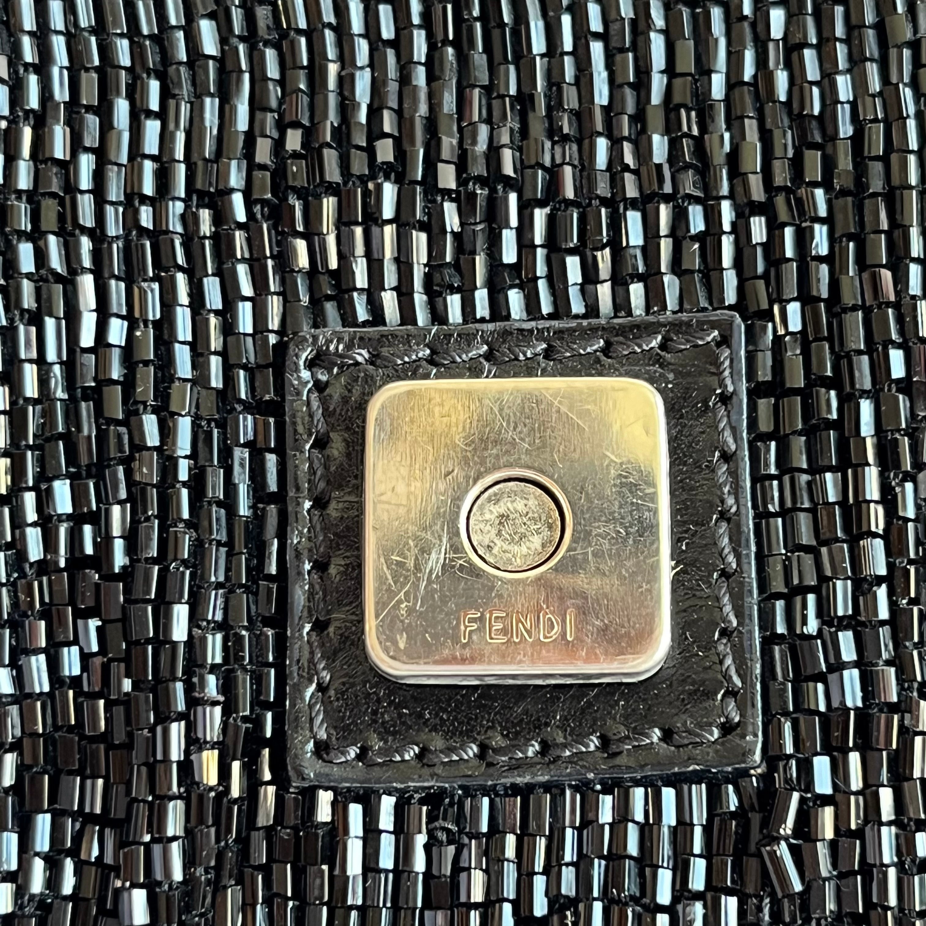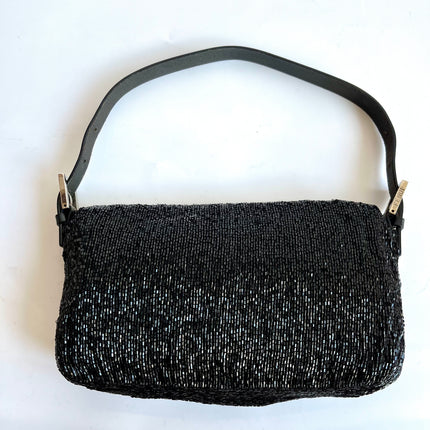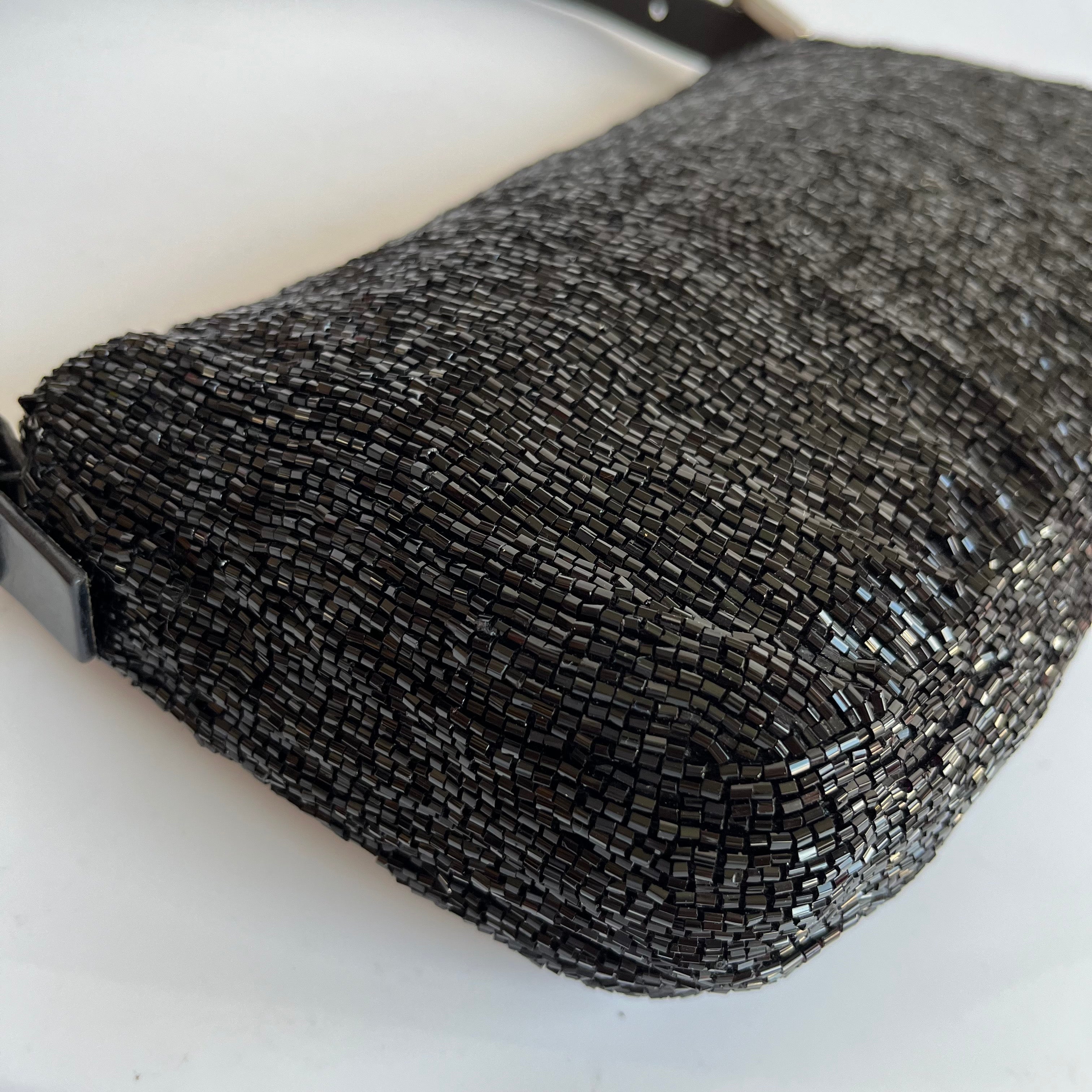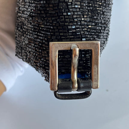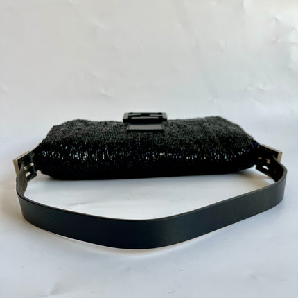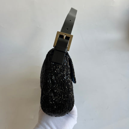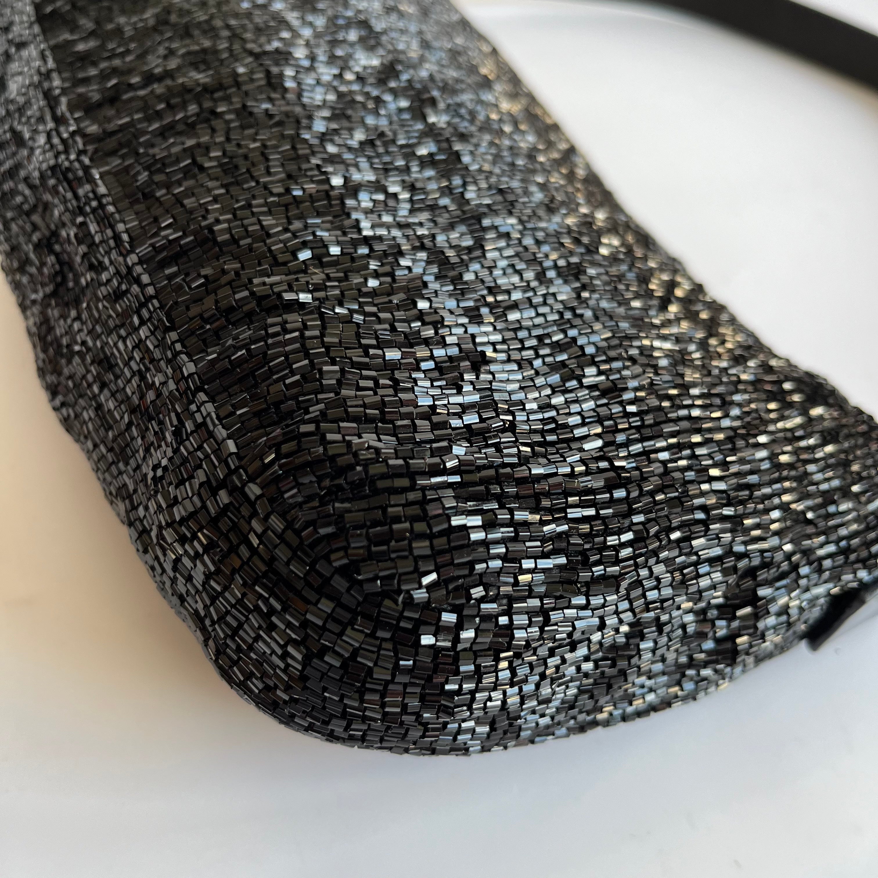 Fendi Baguette Vintage Black Glitter Beads Shoulder Bag Blue Silk Interior