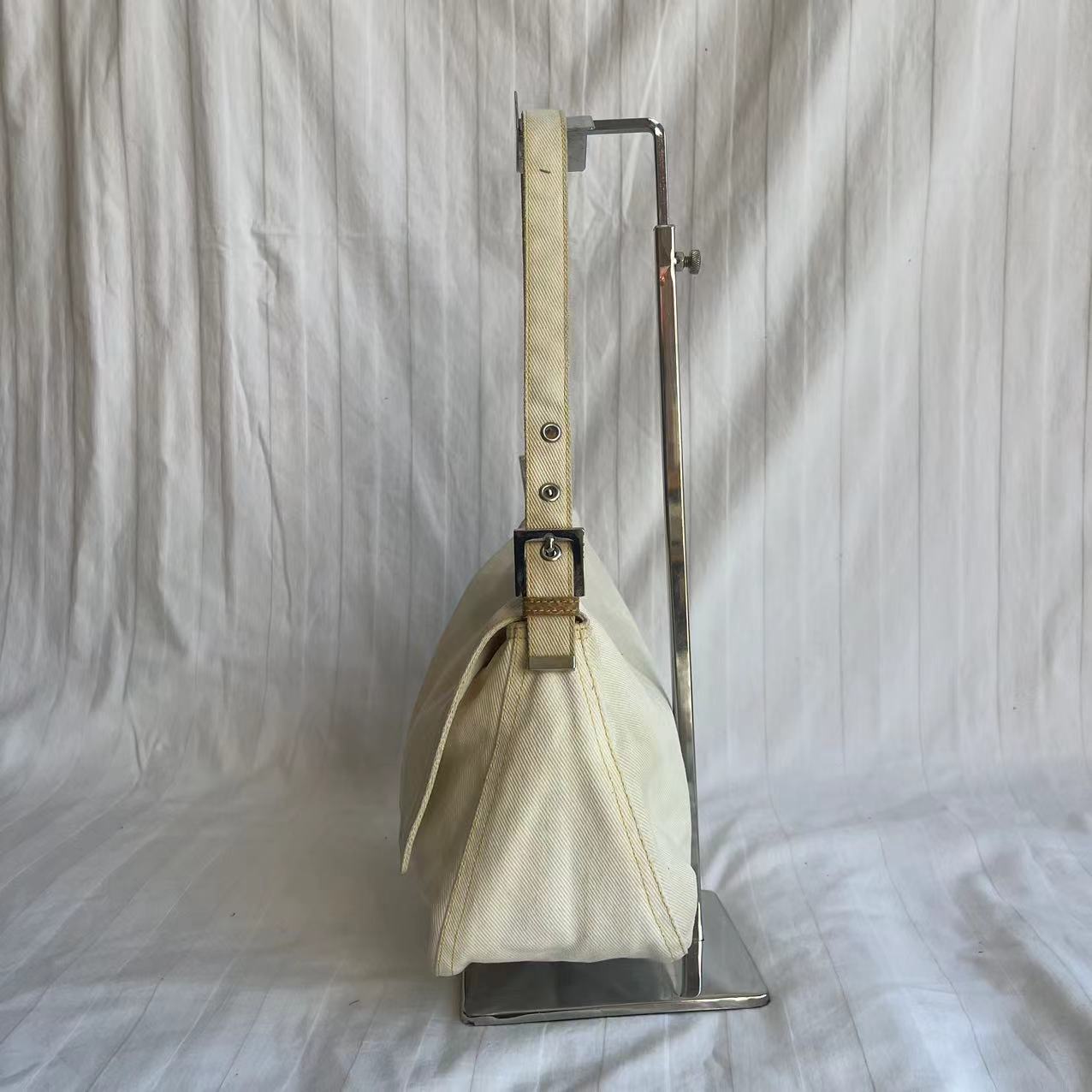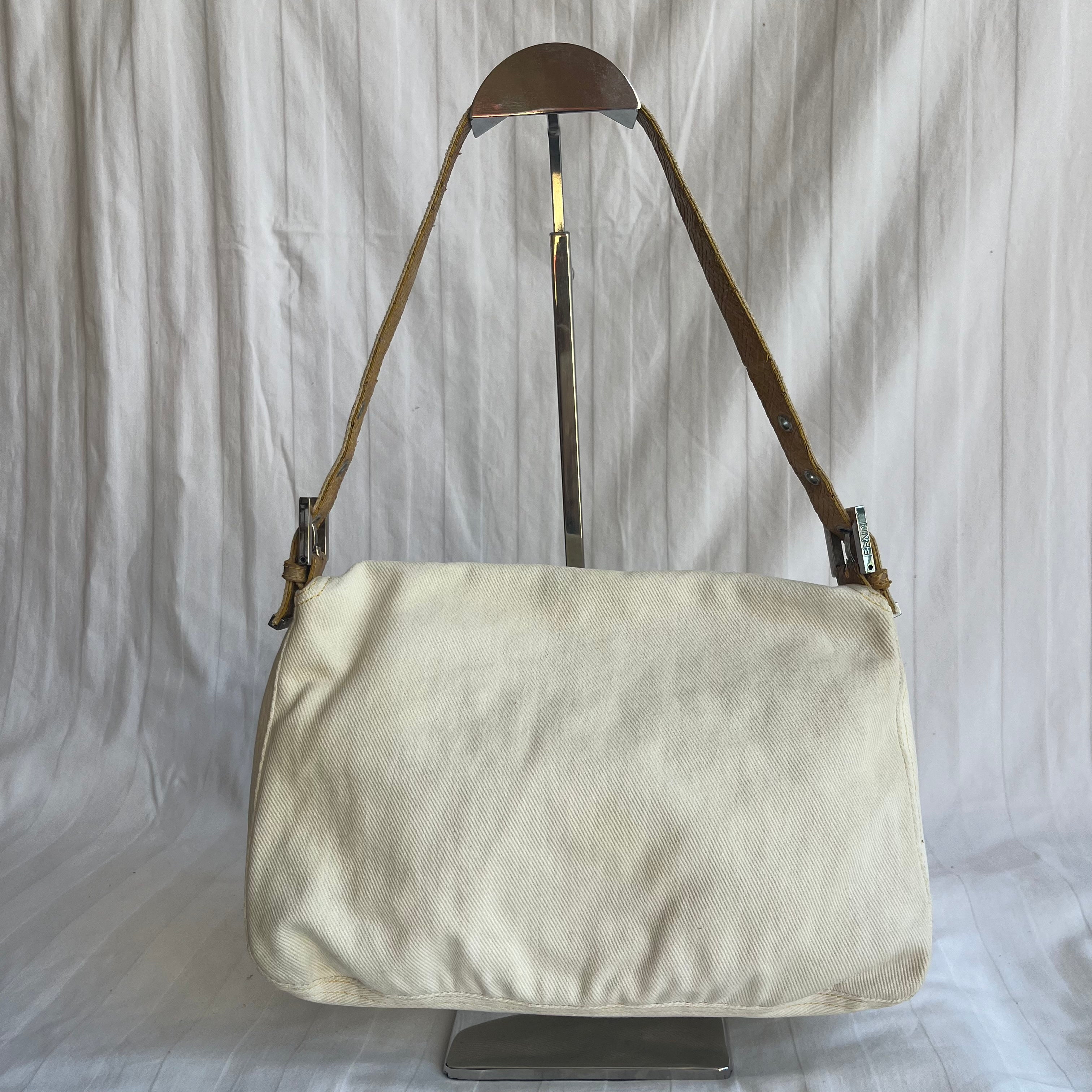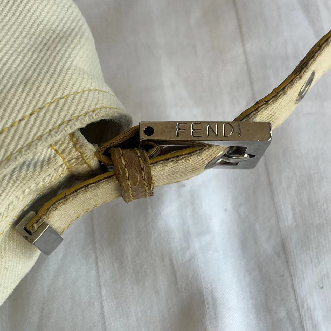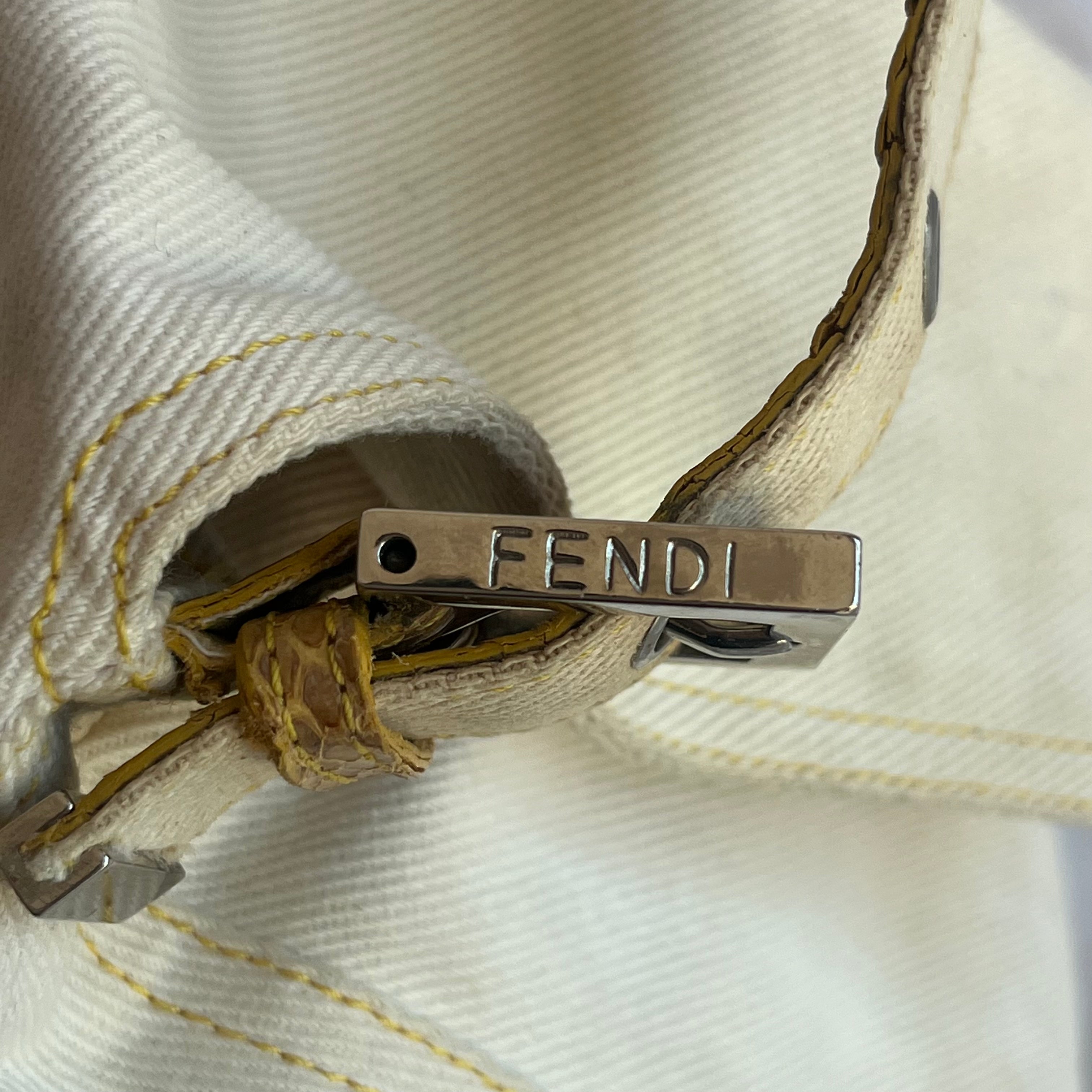 Fendi Mamma Baguette Vintage White Denim Yellow Snake-Skin Leather Strap Shoulder Bag