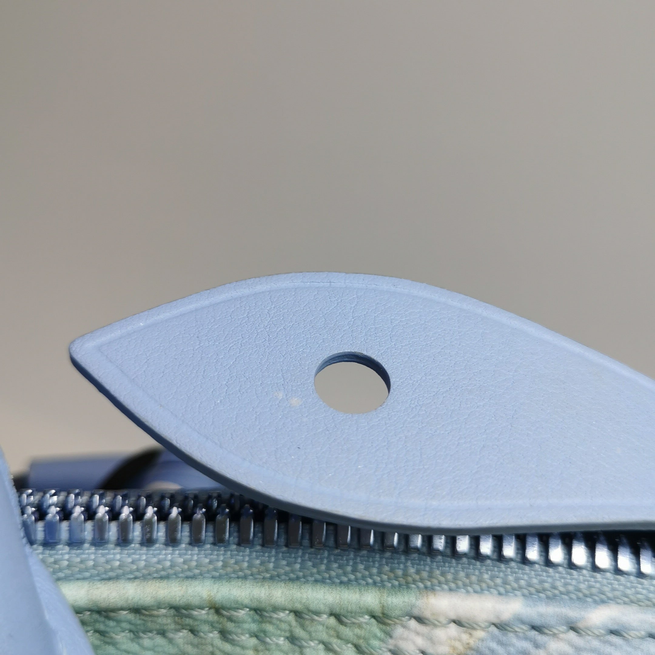 Scuffs around the corners. Light stains on the exterior and interior. Cracks on the wax of the handle edges. Scratches to the hardware.